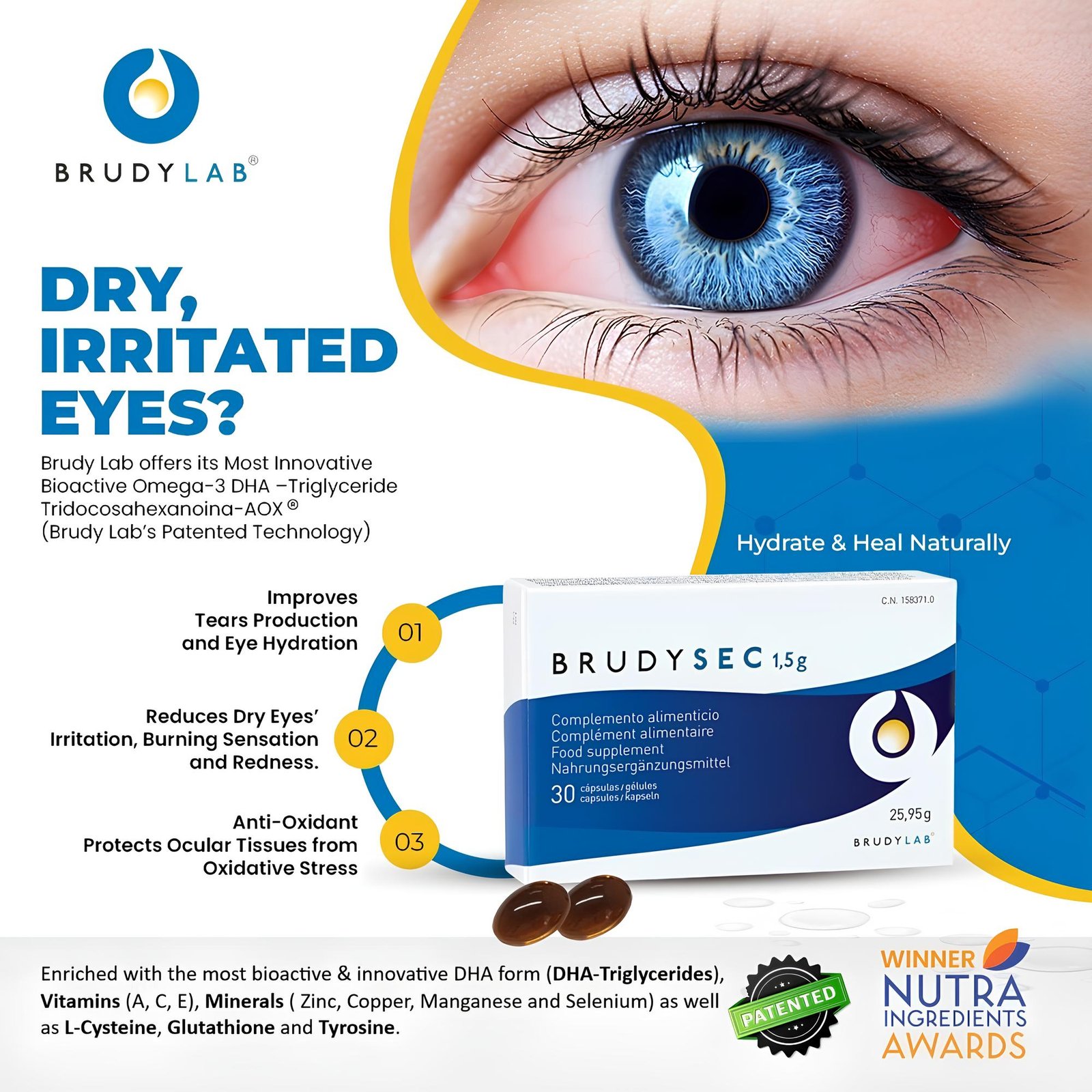 Brudy Sec helps relieve dry eye discomfort by naturally supporting tear production and eye hydration. Its unique formula works at the glandular level to promote healthier, more consistent tear secretion. With regular use, it helps reduce dryness, irritation, and the need for frequent use of artificial tears.
